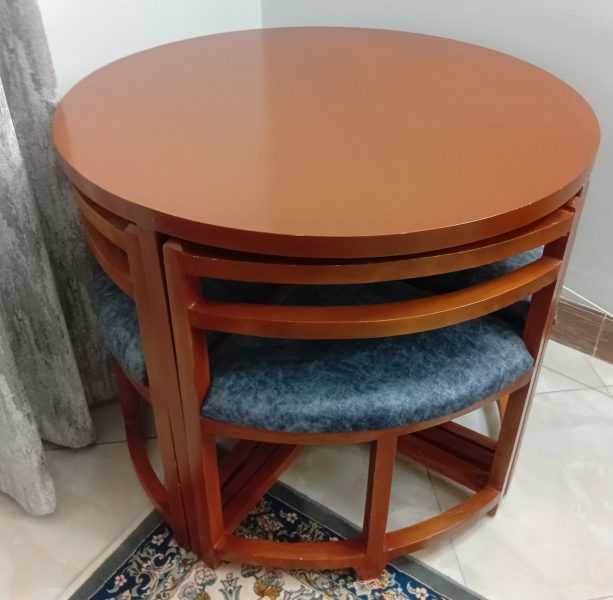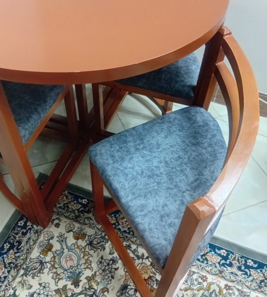 میز ناهار خوری گرد کم جا چهار نفره جنس چوب یکسال پیش خریداری شده بلااستفاده بوده جنس روی صندلی ها پتینه.