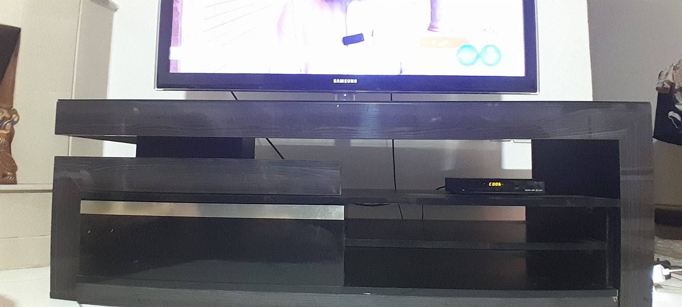 یک عدد میز تلوزیون درحد نو به رنگ مشکی و قهوه ای سوخته دارای یک کشو پایه ی متحرک صفحه ای شیشه ای