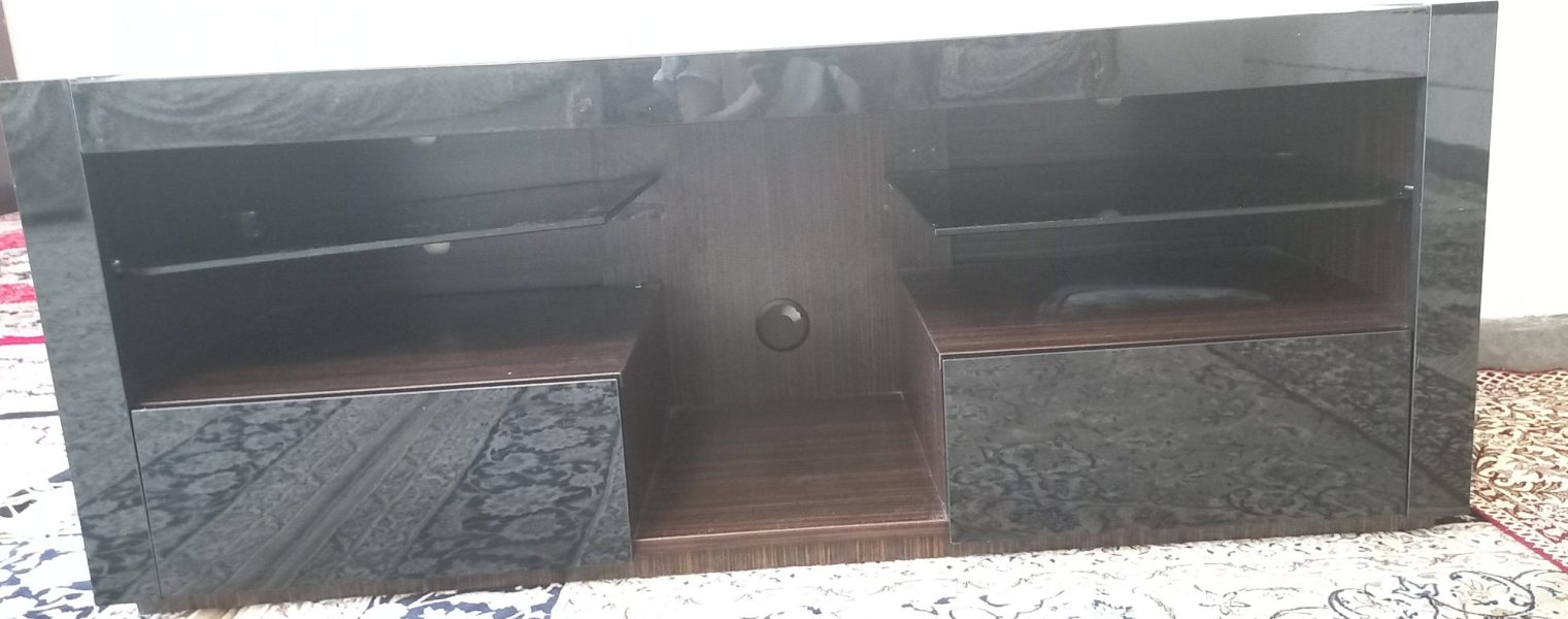میز تلویزیون رنگ مشکی شیشه ای داخلش قهوه ای