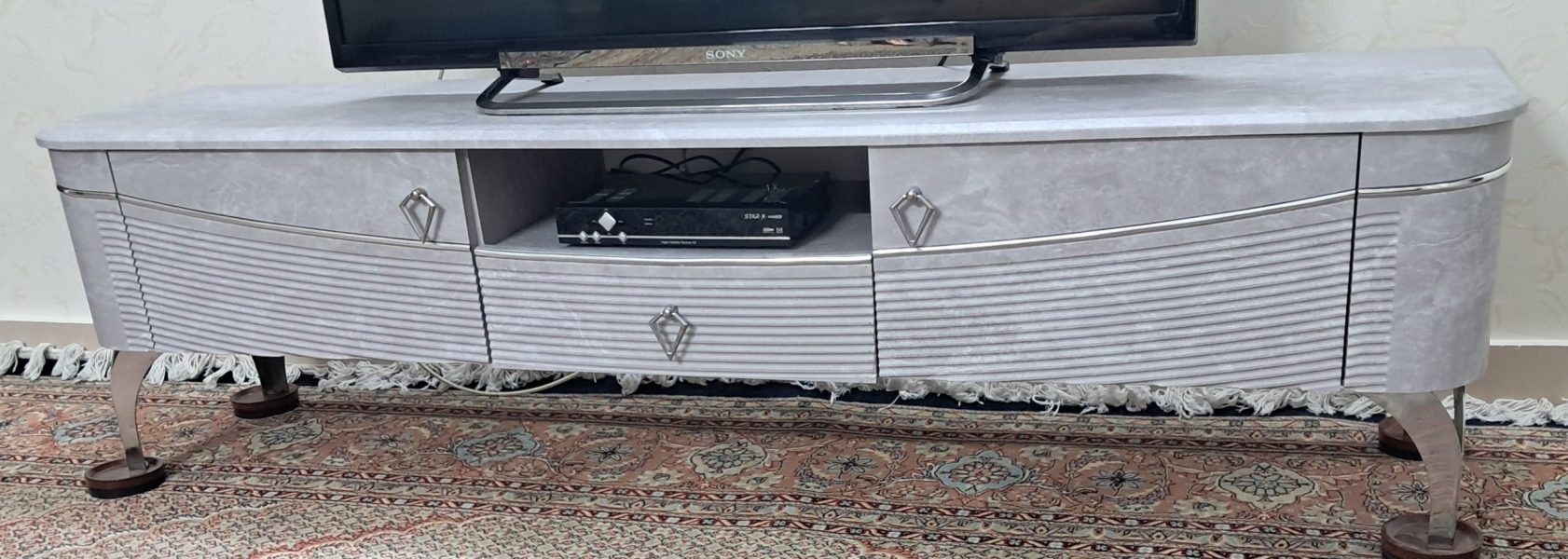 میز تلویزیون کاملا نو مناسب برای جهیزیه در عرض ۱۷۰ سانتی متر بدنه کاملا سالم بدون خط و خش دارای یک کشو و دو کمد