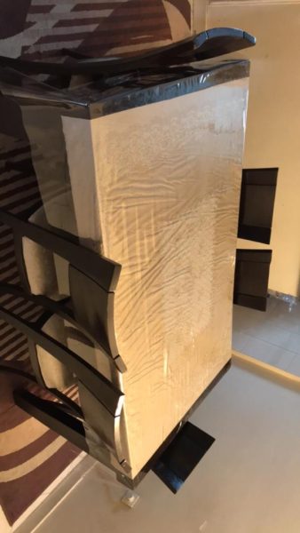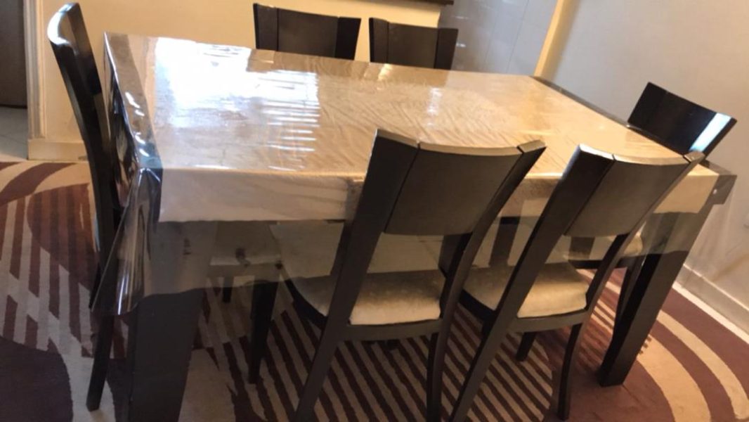 میز صندلی ۶ نفره نیاز به تعویض روکش صندلی ، همراه با یک عدد رومیزی سفره ای و یک رومیزی شیشه ای