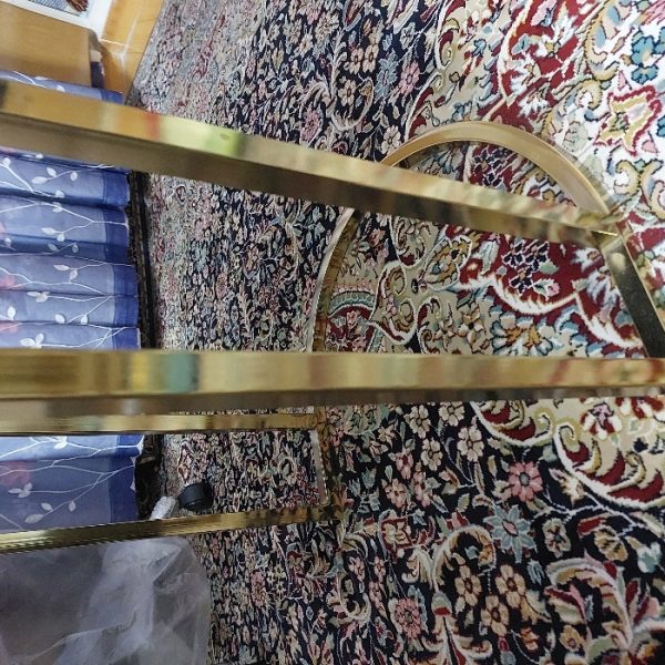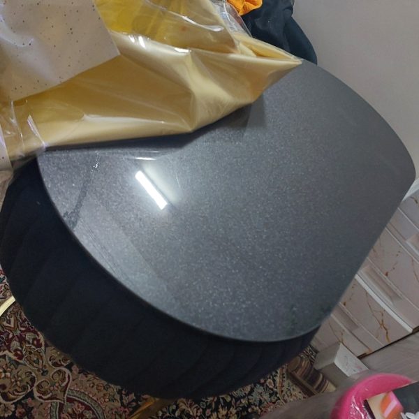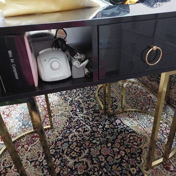 میز ناخن دارای یک کشو و یک سمت دیگر جای مربع خالی پایه طلایی رنگ ثابت رویش شیشه دارد فقط موقع کارخانه یک خش دارد از روزی که گرفتم رو میزی انداختم مثل روز اول کناره ها مخمل رنگ مشکی میز ناخن تنها ۵۰۰۰۰۰۰