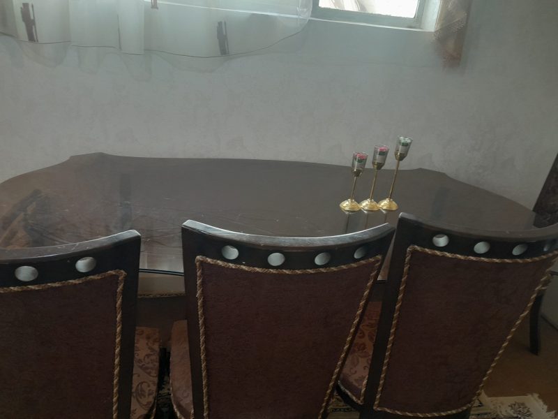 میز ناهار خوری هشت نفره با شیشه و دو پایه برای زیر آن و دارای هشت صندلی به فروش میرسد