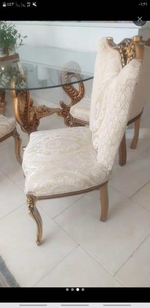 میزناهار خوری هشت نفره .چوب واقعی .شیشه ده میل برش خورده .پارچه کتان ترک .صندلی ها کاملا سالم و بدون پارگی .نشیمن ها پر و سالم