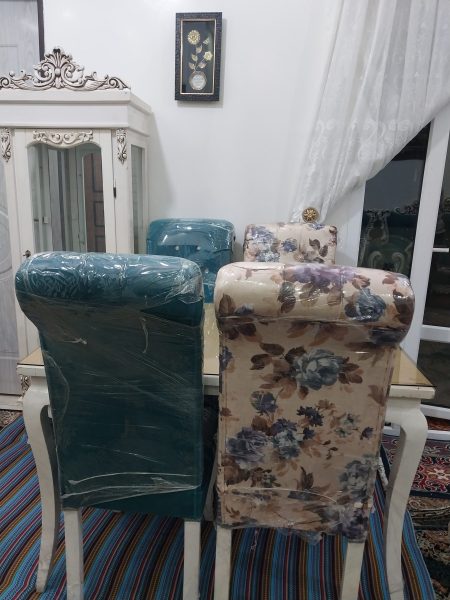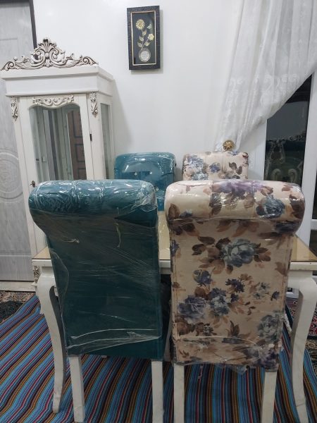 میز غذا خوری چهار نفره صندلی ها نو و پارچه مبلی روی میز شیشه دودی میخوره و صندلی ها هنوز سلفن هستند و استفاده نشده کاملا سالم وتمیز و جنس خوب
