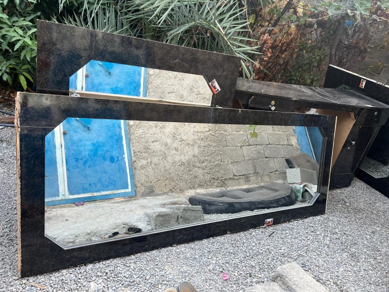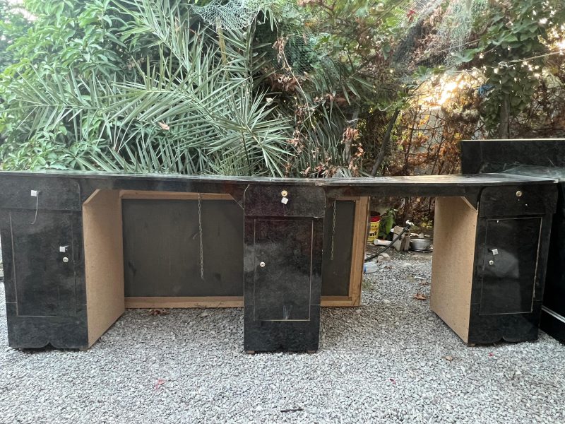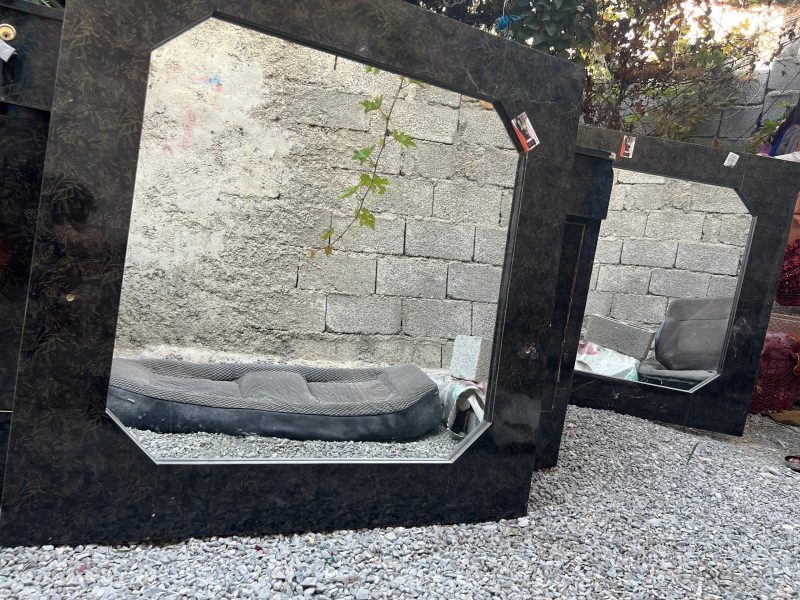 یک میز بزرگ برای دو صندلی دو آیینه کوچک و یک آیینه بزرگ دیواری هم اندازه میز