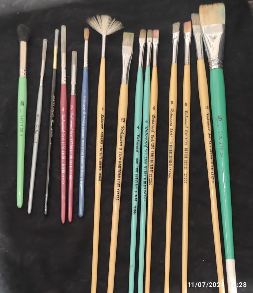 سه پایه نقاشی ،13تا رنگ روغن کمی استفاده شده روغن، بزرک ،سه تا کاردک ،بسته تقریباً کامل قلمو ،کیف قلمو ،
