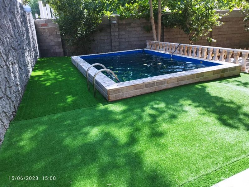 داخل حیاط کف سازی و محوطه سازی شده، استخر تابستانی به مساحت ۱۸ متر دارای پر کن و تخلیه.
