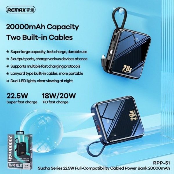 پاوربانک 20000 میلی آمپر ریمکس مدل RPP-51 یکی از محبوب ترین پاوربانک های برند ریمکس است. پاوربانک 20000 میلی آمپر ساعت ریمکس مدل RPP-51 با دارا بودن شارژ سریع 20 واتی و لوازم جانبی که به همراه دارد از کاربردی ترین مدل های موجود می باشد. این پاوربانک دسته قابل حمل دارد که کاربری آن را برای مصرف کننده آسان نموده است. همچنین به دلیل ظرفیت 20000 میلی آمپر ساعت و قابلیت شارژ همزمان سه دستگاه را تا 22.5 وات دارا می باشد. از دیگر ویژگی های مهم پاوربانک ریمکس مدل RPP-51، جنس بدنه آن می باشد که از جنس ABS+PC ضد آتش ساخته شده است.برای این پاوربانک یک پورت ورودی Type-C و یک پورت خروجی USB است.