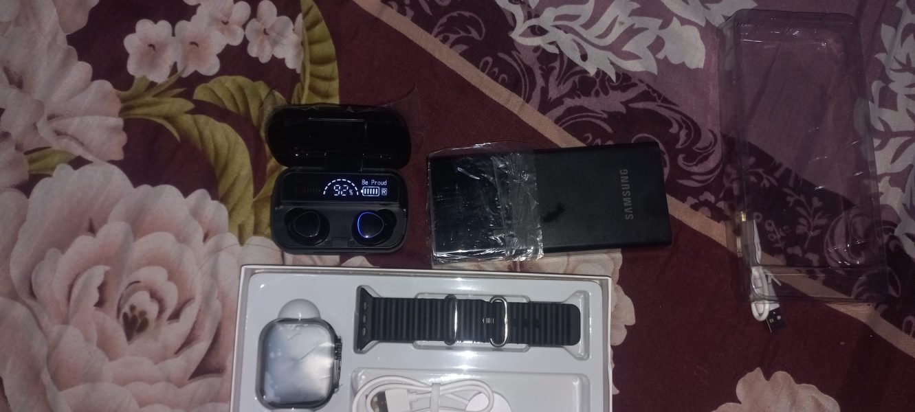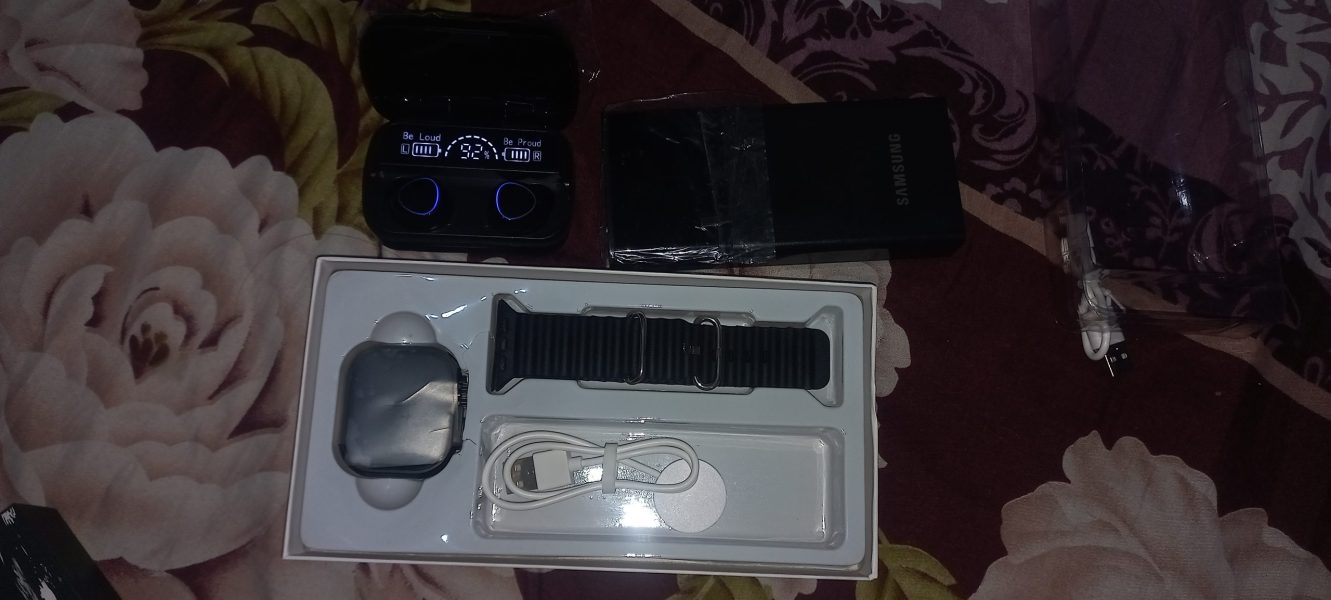 یک عددپاور بانک وهندزفری بلوتوثی وساعت هوشمند نو واکبند هستن بدون استفاده درضم پاور مارک سامسونک ۲هزار میلی امپر وهندزفری هم قابلیت شترج گوشی هستش یچیزی خیلی کارایی هستش باتشکر