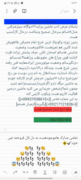مدارک معاینه فنی موجودهست ومدارک سندوبیمه نامه ۳ماه داردبیاببین سوارشونظرت روبده اتاقک بدون صداوبدون کوچک ترین ایراد