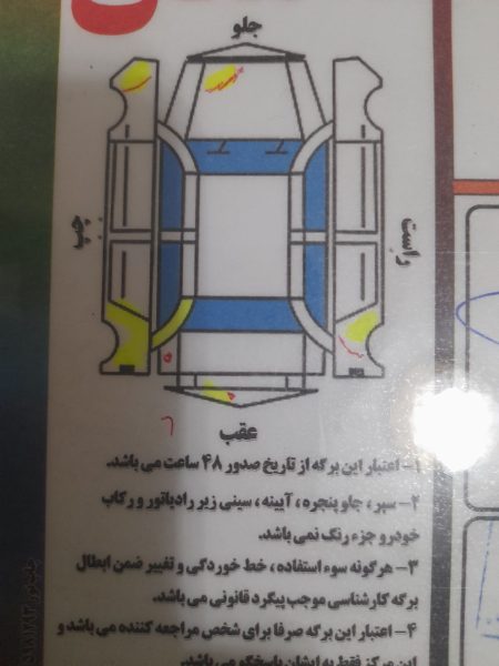باسلام ماشین درحد آخر 1393/12/05 تایر عقب 50 درصد تایر جلو 70 درصد دارایه هدلایت با شیسه دودی و باند سینه جدید عکس تشخیص رنگش رو هم گذاشتم. باتشکر
