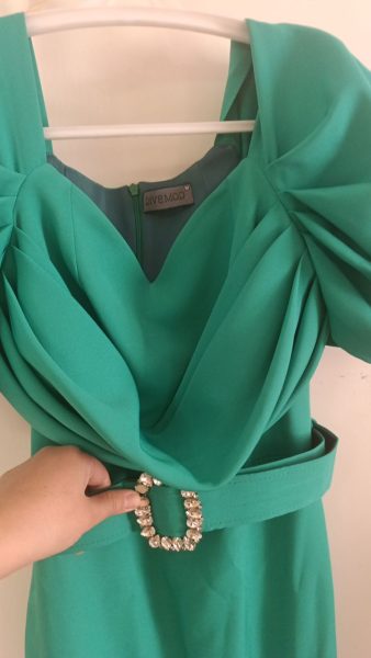 پیراهن مجلسی خوشرنگ و خاص به رنگ فیروزهای، سایز حدود ۴۰–۴۲.