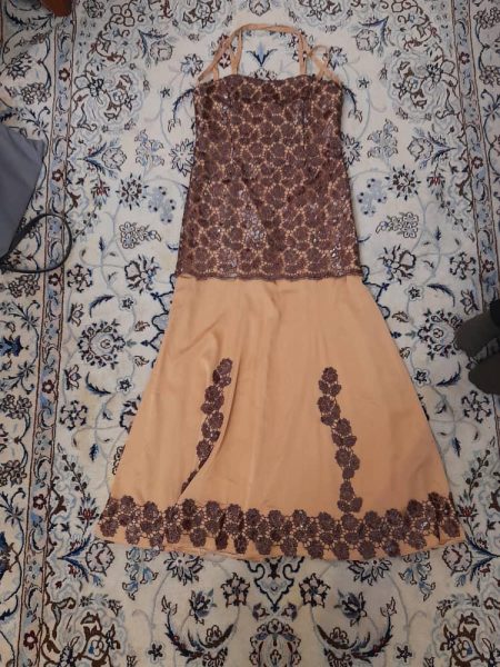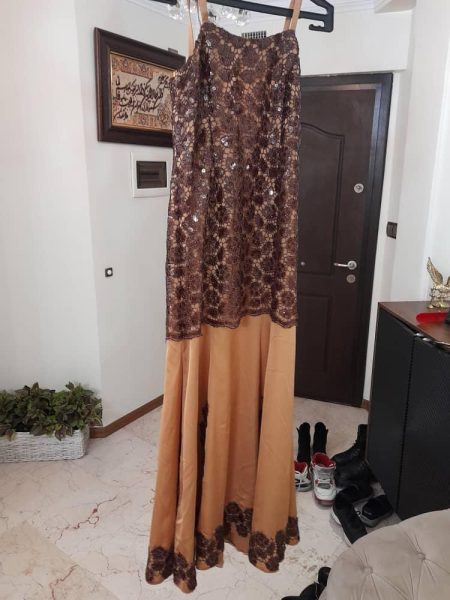 پیراهن مجلسی گیپور سایز ۴۰ رنگ کرم قهوه ایی فقط یکبار استفاده شده و کاملا سالم هست