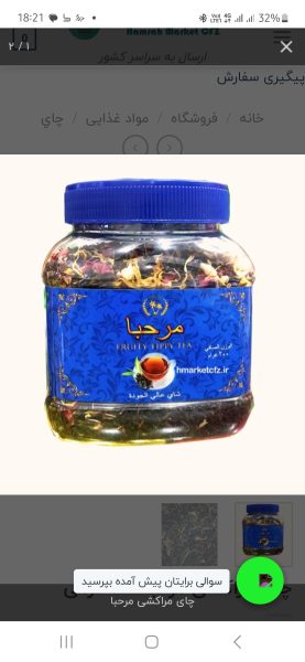 چای مراکشی مرحبا دارای : چای سیاه، چای سبز،شکوفه یاس، تکه های میوه های استوایی،برگاموت،گل گلرنگ،روغن سورسپ