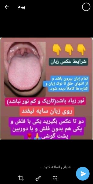 خانم ظاهرى هستم كارشناس طب سنتى به منظور حفظ و بالا بردن سطح سلامت جامعه تيم سفير سلامت ما در نظر دارند به مدت Y روز مزاج شناسى و چكاپ رايكان براى همه شما هم وطنان عزيز داشته باشند براي اطلاع از مزاج بدنتون و سونوگرافى كامل عكس زبانتون رو با دوربين عقب كوشى به همراه سن قد وزن و شماره تماس برامون بفرستيد
