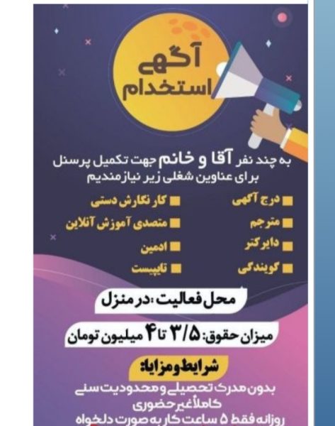 به تعدادی نیروی فعال فعال در اینترنت جهت کار پاره وقت با درآمد خوب بدون و سرمایه نیازمندیم.