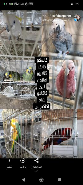 گالاروز ماده آمازون نر ماده کاسکو تعداد ۵۰ عدد شاه طوطی ۱۵ عدد کاکادو ۴ کایک ماده لری ۶ عدد عروس ۲۰۰ عدد گرینچیک ۲۰۰ عدد اکلکتوس نر ماده ملنگو نر ماده راهب ابی سبز خورشیدی ۶ عدد ملنگو طوسی آبی دستی کوتوله ۱۰۰ تاو چیزهای دیگه
