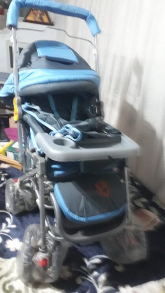 کالسکه بچه حد نو 4 چرخ سالم رنگ نقره ای وآبی