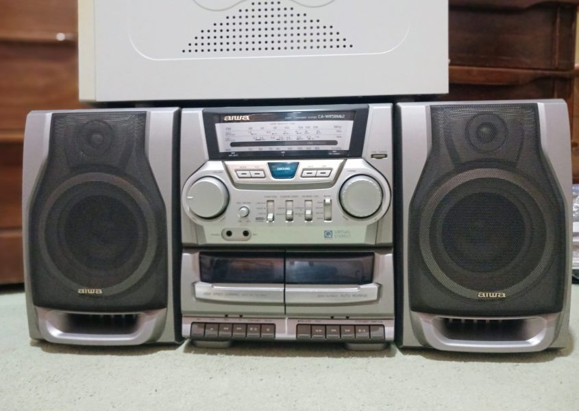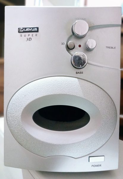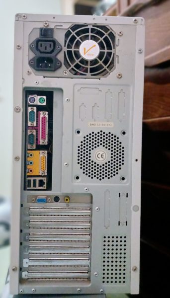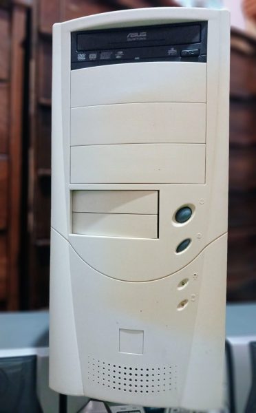 یک عدد کامپیوتر قدیمی رنگ سفید همراه با کیس و کیبورد و دو اسپیکر به علاوه یک ظبط