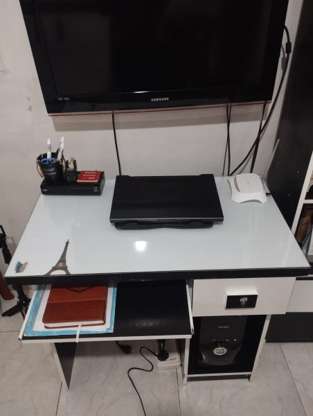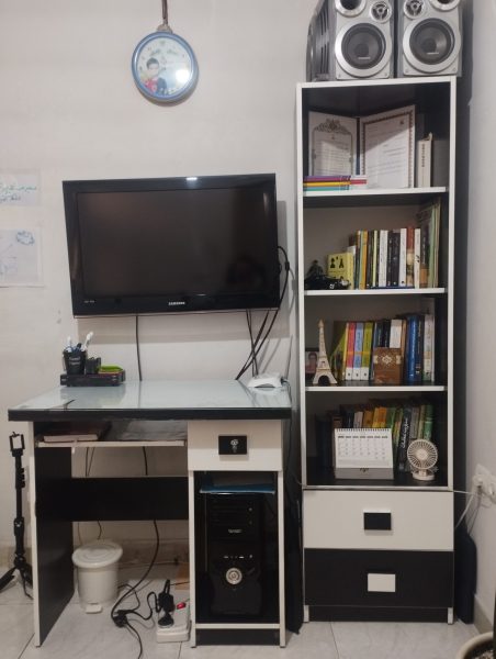کتابخانه و میز کامپیوتر و تحریر سفید و مشکی.