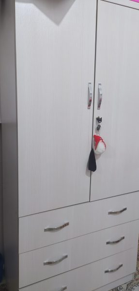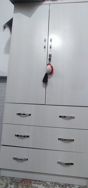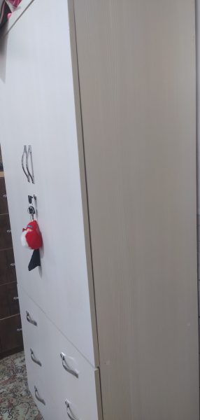 کمد ام دی اف سفید فقط پشتش یکم کنده شدع که داخل عکس معلومه و ریلاش یکم مشکل دارع وگرنه همه چیش سالمه