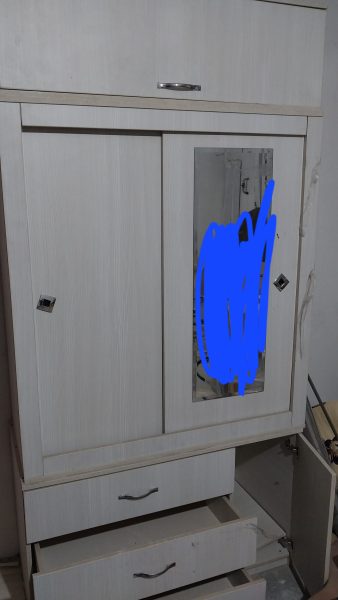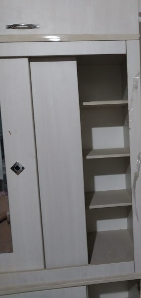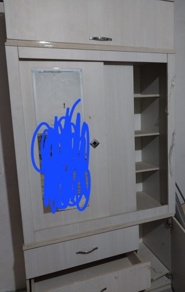 کمد سه تیکه تمیز سالم دارای انبار بالای کمد و اویز لباس و سه کشو پایین و چند قفسه داخلی کنار کمد .کمدی محکم و تمیز تنها ایرادش ک قابل تعمیر هست تعویض ریل کشوی وسط تخفیف هم داره