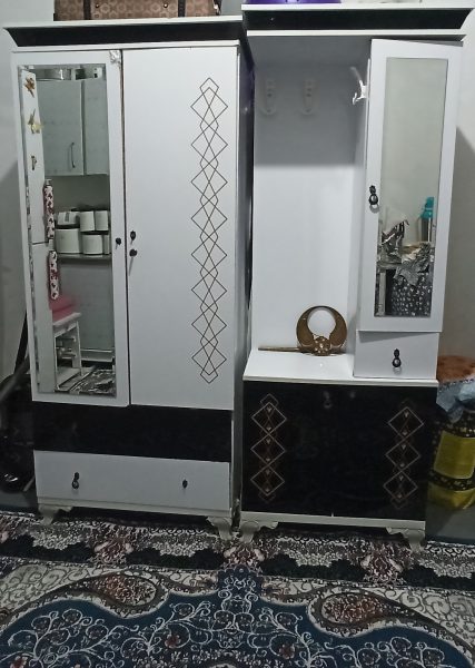 سلام کمد لباس سالم وکمد جاکفشی فقط یه ذره ازپشت شکسته که اندازه ترک مشخص نمیشه چون پشتش مشکل دیگه نداره مشتری نیستید لطفا وقت همو نگیریم.یه تخفیف کوچیکم داره ممنون ازدیوار