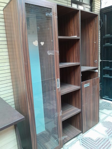 کمد ام دی اف چوبی کاملا سالم رنگ قهوه ای ویک عدد میز تحریر سالم وبلند
