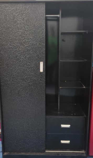 سلام ی کمد مشکی با چهار قفسه کوچیک و یک قفسه بزرگ برای جا لباسی به همراه دو کشاب سالم و جا دار.