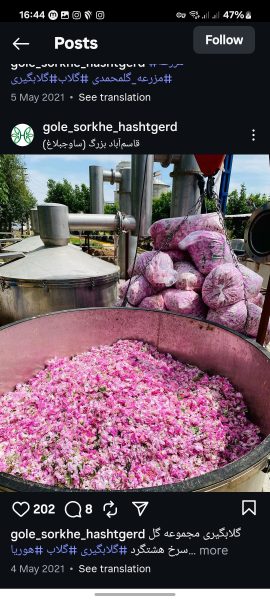 گلاب فارسیان گلاب سه اتیشه با عیار ۵۰ بدون ناخالصی و اصل اصل سه بار با گل محمدی تقطیر داده شده گل محمدی از باغ قمصر هستش گل ناب