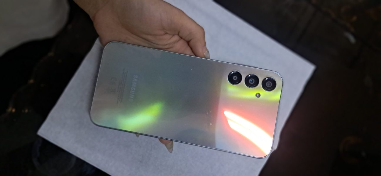 گوشی. A24 در حد نو رنگ نقره ای دور استیل پشت شیشه رم ۸ حافظه ۱۲۸ گیگ