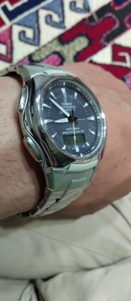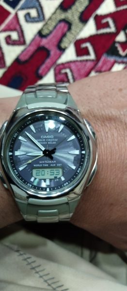 یک عدد ساعت آنتیک کاسیو آکودرایو سولار بدون نیاز به باطری با نور لامپ یا خورشید یا هر نور دیگی شارژ میشه با امواج رادیویی یا هر نقطهای ایران یا دنیا باشی ساعت همون منطقه تنظیم میکنه بسیار خاص تک اصل ژاپن است ضد آب صدرصد پلمپ کمیاب میوتا ژاپن
