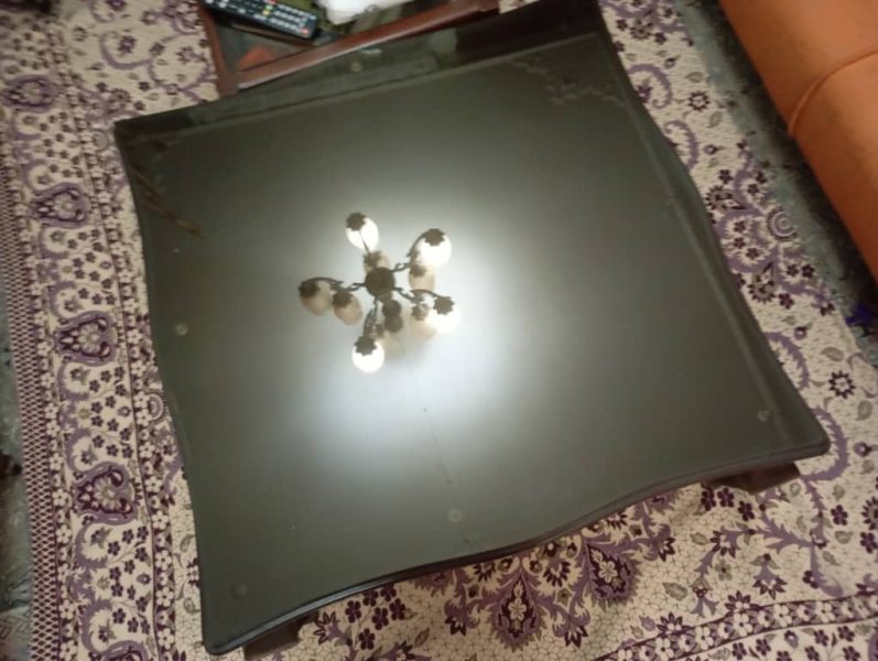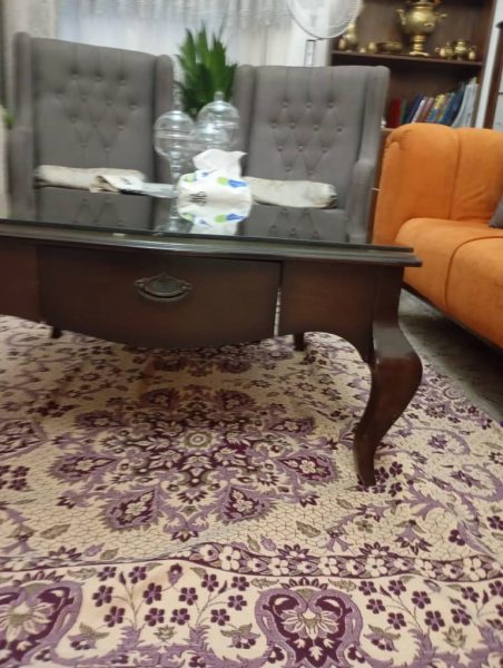 کارکرده ولی چوب درجه یک و شیشه هم داره که کمی ترک کوچولو از لبه داره با چسب شیشه چسبانده شده دودی ده میلی هستش اندازه ۸۰ در ۸۰ و یک کشو هم داره